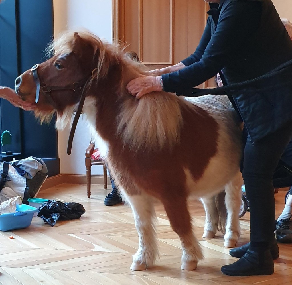 Je me déplace sur site pour des temps de médiation équine avec la mini-shetland Kalista.